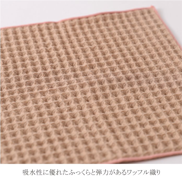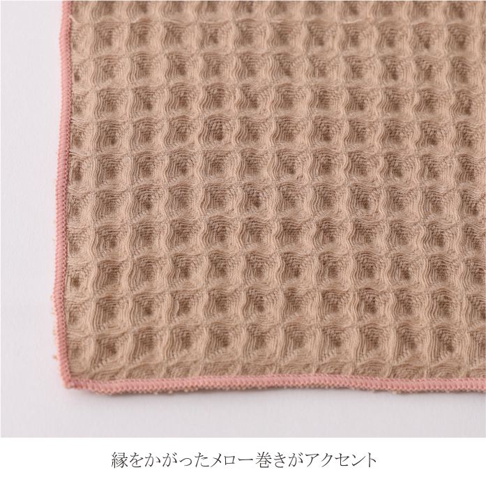 焼き菓子みたいな格子状の凹凸があるワッフル織りに、引き締め効果を担う縁かがりの色を吟味。ふっくらと弾力があって軽く、さらりとした肌触りが好きな素材でハンドタオルを作りました。選んだ生地は吸水性がよくて乾きも早く、毛羽落ちの少なさも魅力です。日常使いのバッグに忍ばせるだけでなく、お客さまを迎える日のテーブルにおしぼりとして用意するのもおすすめ。パイルタオルとはまた違う印象と使用感だから、小ぶりのインテリアバスケットに敷いたり掛けたりしてもよさそう。洗濯を重ねるにつれて目が詰まり、立体感とふくらみがアップ。この生地ならではの表情の揺らぎも生まれ、ますます愛着が湧いてきます。